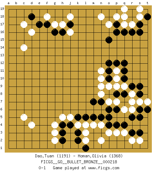 Last move : 0-1 2019 December 11 1:5:21 [Event "FICGS__GO__BULLET_BRONZE__000218"] [Site "FICGS"] [Date "2019.12.11"] [Round "1"] [Black "Dao,Tuan"] [White "Homan,Olivia"] [Result "0-1"] [Rating 1 "1191"] [Rating 2 "1368"] 1.q16 d4 2.q4 d16 3.q10 o17 4.o15 r17 5.r16 q17 6.p17 p18 7.p16 n18 8.s17 s18 9.s16 o3 10.r18 q18 11.t18 s19 12.r19 q19 13.f17 c14 14.d18 r6 15.r5 q6 16.o4 n4 17.o5 p3 18.p4 q3 19.r3 r2 20.s3 s2 21.s6 s7 22.t6 r8 23.q8 q9 24.r9 p9 25.s8 r7 26.s9 t7 27.s5 p10 28.q11 p11 29.q12 o7 30.p6 p7 31.n5 m4 32.m5 l4 33.l5 k4 34.k5 j5 35.j4 h5 36.h4 g4 37.h3 g3 38.h2 g2 39.k2 l2 40.k3 l3 41.l1 n2 42.p12 n11 43.o12 c17 44.o11 n10 45.o10 o9 46.p8 n9 47.n7 h17 48.o6 n8 49.m7 c5 50.h16 j16 51.j17 g17 52.g16 f18 53.e17 j18 0-1 Here are the names of the openings (joseki) played in the four corners : Corner q16 : q16 o17 Hoshi (Hwajeom, Seongjeom, Xingwei`) 4-4 Point. The star or hoshi (4-4) point, emphasizing influence at the potential expense of territory. Ikken Kakari (Hankan Keolch'im, Yi Gua`jiao~, 1-Space Low Approach). White 2 is the standard approach move to the 4-4. Corner q4 : q4 o3 Hoshi (Hwajeom, Seongjeom, Xingwei`) 4-4 Point. The star or hoshi (4-4) point, emphasizing influence at the potential expense of territory. Ikken Kakari (Hankan Keolch'im, Yi Gua`jiao~, 1-Space Low Approach). White 2 is the standard approach move to the 4-4. Corner d16 : d16 f17 Hoshi (Hwajeom, Seongjeom, Xingwei`) 4-4 Point. The star or hoshi (4-4) point, emphasizing influence at the potential expense of territory. Ikken Kakari (Hankan Keolch'im, Yi Gua`jiao~, 1-Space Low Approach). Black 2 is the standard approach move to the 4-4. Player White won this Go (weiqi, baduk) game. Follow this game move after move (download)Go is to western chess what philosophy is to double entry accounting. (from Shibumi, by Trevanian) The beginning is the most important part of the work. (Plato)