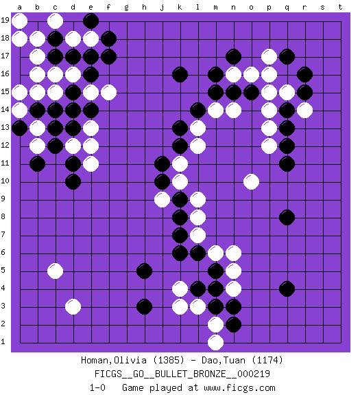 Last move : 1-0 2019 December 11 1:34:49 [Event "FICGS__GO__BULLET_BRONZE__000219"] [Site "FICGS"] [Date "2019.12.11"] [Round "1"] [Black "Homan,Olivia"] [White "Dao,Tuan"] [Result "1-0"] [Rating 1 "1385"] [Rating 2 "1174"] 1.q4 d16 2.q17 d3 3.f17 d18 4.k16 q15 5.r15 r14 6.r16 p16 7.q14 p14 8.q13 p13 9.q12 p12 10.q11 o10 11.q8 p17 12.o15 p15 13.n17 n16 14.m16 o16 15.m15 n14 16.n15 m14 17.l14 l13 18.k13 l12 19.k12 k11 20.j11 k10 21.j10 j9 22.k9 l9 23.k8 l8 24.k7 l7 25.k6 k3 26.l6 m6 27.m5 n6 28.l4 l3 29.m3 n4 30.m4 m2 31.n2 m1 32.n3 n5 33.h3 k4 34.h5 c5 35.c14 d14 36.d13 e13 37.d15 e15 38.e14 c15 39.d14 b15 40.e16 f15 41.d17 c16 42.c17 b17 43.c18 b18 44.b14 c19 45.e17 e18 46.f18 a14 47.a13 a15 48.a16 b16 49.a17 a18 50.b19 a19 51.e19 b13 52.c12 b12 53.b11 d12 54.d11 e12 55.c13 e11 56.d10 1-0 Here are the names of the openings (joseki) played in the four corners : Corner d16 : d16 f17 Hoshi (Hwajeom, Seongjeom, Xingwei`) 4-4 Point. The star or hoshi (4-4) point, emphasizing influence at the potential expense of territory. Ikken Kakari (Hankan Keolch'im, Yi Gua`jiao~, 1-Space Low Approach). Black 2 is the standard approach move to the 4-4. Corner q16 : q17 q15 Komoku (Somok, Xiao~mu`) 3-4 Point. The komoku (3-4) point is the traditional corner enclosure move.. Ikken Takagakari (Hankan Nop'dakeolch'im, Yi Gaogua`jiao~, 1-Space High Approach). The 5-4 approach move has become more popular in modern times, as modern Go emphasizes speed and influence. Player Black won this Go (weiqi, baduk) game. Follow this game move after move (download)Learn to play under the stones. (Anonymous) Creativity is allowing yourself to make mistakes. Art is knowing which ones to keep. (Scott Adams)