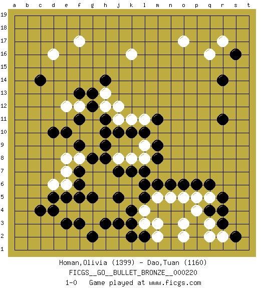 Last move : 1-0 2019 December 11 4:7:50 [Event "FICGS__GO__BULLET_BRONZE__000220"] [Site "FICGS"] [Date "2019.12.11"] [Round "1"] [Black "Homan,Olivia"] [White "Dao,Tuan"] [Result "1-0"] [Rating 1 "1399"] [Rating 2 "1160"] 1.q4 q16 2.c4 d16 3.r14 o17 4.s16 r17 5.r11 o3 6.q6 q2 7.r3 l3 8.c14 f17 9.d10 k16 10.e3 g3 11.j3 j4 12.h3 h4 13.g2 f4 14.f3 g4 15.k3 l4 16.k4 k5 17.l5 m5 18.l6 j6 19.m6 n5 20.n6 o5 21.o6 p5 22.p6 q5 23.r5 r2 24.s2 q3 25.r4 p4 26.l2 m2 27.k2 m3 28.j7 h7 29.h8 g7 30.g8 j8 31.k7 k8 32.f7 f8 33.f9 e8 34.f6 g9 35.h9 g10 36.h10 g11 37.h11 h12 38.k10 j11 39.j10 k11 40.l10 l11 41.g12 f12 42.g13 h13 43.f13 e12 44.f11 f10 45.e10 d6 46.e5 e4 47.d4 g6 48.g5 h6 49.f5 k6 50.l7 e7 51.d5 e6 52.j5 h5 53.j5 l8 54.m8 l9 55.m9 o2 56.m11 j12 57.h14 1-0 Here are the names of the openings (joseki) played in the four corners : Corner q16 : q16 r14 Hoshi (Hwajeom, Seongjeom, Xingwei`) 4-4 Point. The star or hoshi (4-4) point, emphasizing influence at the potential expense of territory. Ikken Kakari (Hankan Keolch'im, Yi Gua`jiao~, 1-Space Low Approach). Black 2 is the standard approach move to the 4-4. Corner q4 : q4 o3 Hoshi (Hwajeom, Seongjeom, Xingwei`) 4-4 Point. The star or hoshi (4-4) point, emphasizing influence at the potential expense of territory. Ikken Kakari (Hankan Keolch'im, Yi Gua`jiao~, 1-Space Low Approach). White 2 is the standard approach move to the 4-4. Corner d16 : d16 c14 Hoshi (Hwajeom, Seongjeom, Xingwei`) 4-4 Point. The star or hoshi (4-4) point, emphasizing influence at the potential expense of territory. Ikken Kakari (Hankan Keolch'im, Yi Gua`jiao~, 1-Space Low Approach). Black 2 is the standard approach move to the 4-4. Player Black won this Go (weiqi, baduk) game. Follow this game move after move (download)Balance is not what players strike for, and if it does arise, it is in spite of them. (Pierre Audouard) A computer lets you make more mistakes faster than any invention in human history - with the possible exceptions of handguns and tequila. (Mitch Ratcliffe)