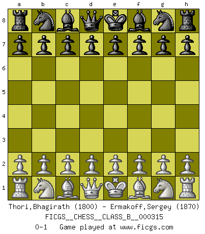 Last move : 0-1 2020 January 20 23:50:29 [Event "FICGS__CHESS__CLASS_B__000315"] [Site "FICGS"] [Date "2019.12.11"] [Round "1"] [White "Thori,Bhagirath"] [Black "Ermakoff,Sergey"] [Result "0-1"] [WhiteElo "1800"] [BlackElo "1870"] 0-1 This chess game has been lost on time (started : 2019.12.11 17:18:52) Player Black won this chess game. Follow this game move after move (download)Chess is above all, a fight ! (Emanuel Lasker) Man kann eine Schachpartie nur gewinnen, wenn das Gleichgewicht gestört ist. In einer Stellung mit ungestörtem Gleichgewicht ist auch das größte Genie hilflos - in der Stellung steckt dann eben kein genialer Einfall. (Wilhelm Steinitz) Realmente no sabemos como el juego fue inventado, aunque hay sospechas. Tan pronto como descubramos a los culpables, se los haremos saber. (Bruce Pandolfini) Les Echecs ont trois composantes : le temps, l'espace et le matériel en dernier. (Mikhail Tal) Remember : Your focus determines your reality. (Qui-Gon Jinn in Star Wars ep.1)