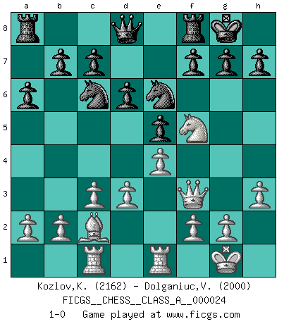 Last move : 1-0 2007 October 8 18:1:11 [Event "FICGS__CHESS__CLASS_A__000024"] [Site "FICGS"] [Date "2007.06.30"] [Round "1"] [White "Kozlov,Konstantin"] [Black "Dolganiuc,Victor"] [Result "1-0"] [WhiteElo "2162"] [BlackElo "2000"] 1.e4 e5 2.Nf3 Nc6 3.Bb5 a6 4.Ba4 Nf6 5.O-O Be7 6.Re1 d6 7.c3 Bg4 8.h3 Bh5 9.d3 O-O 10.Nbd2 Nd7 11.Nf1 Nc5 12.Bc2 Ne6 13.Ng3 Bxf3 14.Qxf3 Bg5 15.Nf5 Bxc1 16.Raxc1 1-0 Ruy Lopez : Closed, Averbach variation Kingside Castling by player White (move 5) Kingside Castling by player Black (move 9) Player White won this chess game. Follow this game move after move (download)The beauty of a move lies not in its' appearance but in the thought behind it. (Siegbert Tarrasch) Ich spiele 70 Eröffnungssysteme. (Viktor Kortschnoi) El Ajedrez demanda una total concentración. (Bobby Fischer) Les pièces de l'échiquier étaient impitoyables. Elles le retenaient, elles l'absorbaient. Il y avait de l'horreur en cela, mais aussi une harmonie unique. Car, qu'y a-t-il dans le monde, à part les échecs ? (V. Nabokov) I can't decide which is riskier; taking crazy risks, or taking advice on crazy risks from a crazy risk taker. (Gregory House in House M.D.)