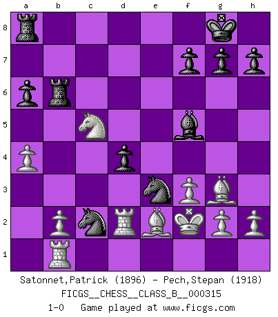 Last move : 1-0 2020 June 23 23:9:36 [Event "FICGS__CHESS__CLASS_B__000315"] [Site "FICGS"] [Date "2019.12.11"] [Round "1"] [White "Satonnet,Patrick"] [Black "Pech,Stepan"] [Result "1-0"] [WhiteElo "1896"] [BlackElo "1918"] 1.e4 e5 2.Nf3 Nc6 3.Bb5 Bc5 4.O-O Nf6 5.Nxe5 Nxe5 6.d4 a6 7.Be2 Nxe4 8.dxc5 Nc6 9.Qd5 Nf6 10.Qd3 d5 11.cxd6 Qxd6 12.Qxd6 cxd6 13.Rd1 d5 14.Bg5 Ne4 15.Bf4 Be6 16.f3 Nf6 17.Nc3 d4 18.Na4 Nd5 19.Bg3 O-O 20.Nc5 Ncb4 21.Nxb7 Rfc8 22.a3 Nxc2 23.Rab1 Nde3 24.Rd2 Rc6 25.Kf2 Rb6 26.Nc5 Bf5 27.a4 1-0 This chess game has been lost on time (started : 2019.12.11 17:18:52) Ruy Lopez : Classical (Cordel) defense Kingside Castling by player White (move 4) Kingside Castling by player Black (move 19) Player White won this chess game. Follow this game move after move (download)My opponents make good moves too. Sometimes I don't take these things into consideration. (Bobby Fischer) Es gibt keine einzige Frau, der ich nicht einen Springer vorgeben könnte und trotzdem gewänne. (Robert James Fischer) El juego de Damas es para vagabundos. (Paul Morphy) La vie est comme un jeu d'échecs : nous esquissons un plan, mais celui-ci est tributaire de ce que daignent faire l'adversaire aux échecs et le destin dans la vie. (Arthur Schopenhauer) He who is a good ruler must first have been ruled. (Aristotle)