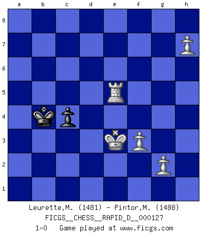 Last move : 1-0 2019 December 30 12:2:46 [Event "FICGS__CHESS__RAPID_D__000127"] [Site "FICGS"] [Date "2019.12.12"] [Round "1"] [White "Leurette,Marc-Antoine"] [Black "Pintor,Manuel"] [Result "1-0"] [WhiteElo "1481"] [BlackElo "1488"] 1.e4 e5 2.Nf3 Nc6 3.Bc4 Qf6 4.O-O Bc5 5.d3 d6 6.a3 a5 7.Nc3 Nge7 8.Nd5 Nxd5 9.exd5 Nd4 10.Nxd4 Bxd4 11.c3 Ba7 12.Bb5+ Bd7 13.Bxd7+ Kxd7 14.b4 axb4 15.Qg4+ Ke8 16.axb4 Qg6 17.Rxa7 Qxg4 18.Rxa8+ Ke7 19.Rxh8 Qg6 20.Rd1 b6 21.Ra8 Qg4 22.f3 Qd7 23.Re1 Qb5 24.Ra7 Kd8 25.c4 Qxb4 26.Kf2 b5 27.cxb5 Qxb5 28.Bg5+ f6 29.Be3 Qxd5 30.Rc1 c5 31.Rca1 Kc8 32.Rxg7 h5 33.h4 f5 34.Rh7 f4 35.R1a7 fxe3+ 36.Ke2 Kb8 37.Rag7 Qa2+ 38.Kxe3 Qe6 39.Rh8+ Qc8 40.Rxc8+ Kxc8 41.Rh7 d5 42.Rxh5 Kd7 43.Rg5 Kd6 44.h5 c4 45.dxc4 dxc4 46.h6 Kc5 47.Rxe5+ Kb4 48.h7 1-0 King's pawn game Kingside Castling by player White (move 4) 10 pieces endgame at move 42 : White KRPPPP , Black KPPP WHITE : King + 1 Rook 4 Pawns BLACK : King + 3 Pawns 9 pieces endgame at move 45 : White KRPPPP , Black KPP WHITE : King + 1 Rook 4 Pawns BLACK : King + 2 Pawns 8 pieces endgame at move 45 : White KRPPP , Black KPP WHITE : King + 1 Rook 3 Pawns BLACK : King + 2 Pawns 7 pieces endgame at move 47 : White KRPPP , Black KP WHITE : King + 1 Rook 3 Pawns BLACK : King + 1 Pawn Player White won this chess game. Follow this game move after move (download)An attack on the wing should be met by play in the center. (Nimzovitch) Garry Kasparov war erst in der Großmeister-Organisation GMA, dann in der Profischach-Vereinigung PCA, zum Schluss kehrte er wieder in den Schoß der FIDE zurück. Aber gut, manche Leute sind flexibel (Viswanathan Anand) Ciertamente, de todas la drogas del mundo, el Ajedrez debe ser el mas placentero permamentemente. (Assiac) Les Echecs sont affaire de jugement sensible. Savoir quand frapper et quand esquiver. (Fischer) Animated gif is worth one mega-word. (Unknown)