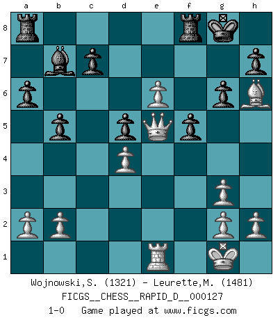 Last move : 1-0 2019 December 30 8:35:31 [Event "FICGS__CHESS__RAPID_D__000127"] [Site "FICGS"] [Date "2019.12.12"] [Round "1"] [White "Wojnowski,Stan"] [Black "Leurette,Marc-Antoine"] [Result "1-0"] [WhiteElo "1321"] [BlackElo "1481"] 1.e4 e5 2.Nf3 Nc6 3.Bb5 Nf6 4.O-O Bc5 5.c3 a6 6.Ba4 b5 7.Bc2 O-O 8.d4 exd4 9.cxd4 Be7 10.Re1 Bb7 11.Nbd2 d5 12.e5 Nh5 13.Nf1 g6 14.Bh6 Re8 15.Qd2 Bb4 16.Qe3 Bxe1 17.Rxe1 Qd7 18.Ng3 Nxg3 19.fxg3 Ne7 20.Qf4 Qe6 21.Ng5 Nf5 22.Nxe6 fxe6 23.Bxf5 exf5 24.e6 Re7 25.Bg5 R7e8 26.Qe5 Rf8 27.Bh6 1-0 Ruy Lopez : Berlin defense, Beverwijk variation Kingside Castling by player White (move 4) Kingside Castling by player Black (move 7) Player White won this chess game. Follow this game move after move (download)Fischer wanted to give the Russians a taste of their own medicine. (Larry Evans) Im Schach gewinnt jeder. Hat man Freunde am Spiel - und das ist die Hauptsache - ist auch der Verlust einer Partie kein Unglück. (David Bronstein) El Ajedrez demanda una total concentración. (Bobby Fischer) Toutes les manuvres exécutées sur une colonne ouverte ont pour but ultime l'intrusion définitive sur la septième ou la huitième rangée, en plein cur de la position ennemie. (Aaron Nimzovitch) The greatest con, that he ever pulled... was making you believe... that he is you. (Revolver, movie)