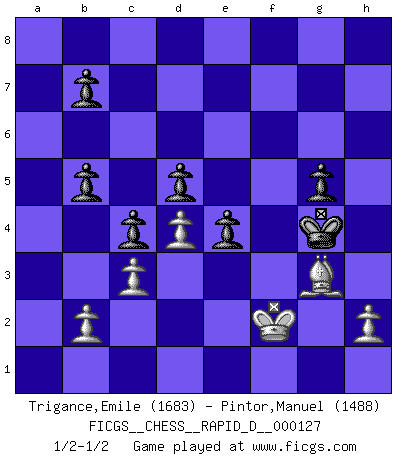 Last move : 1/2-1/2 2020 January 4 14:10:57 [Event "FICGS__CHESS__RAPID_D__000127"] [Site "FICGS"] [Date "2019.12.12"] [Round "1"] [White "Trigance,Emile"] [Black "Pintor,Manuel"] [Result "1/2-1/2"] [WhiteElo "1683"] [BlackElo "1488"] 1.e4 e5 2.f4 Nc6 3.Nf3 Bc5 4.fxe5 Nxe5 5.Nxe5 Qh4+ 6.g3 Qxe4+ 7.Qe2 Qxe2+ 8.Bxe2 Nf6 9.c3 O-O 10.d4 Bb6 11.Nc4 d5 12.Nxb6 axb6 13.Bg5 Ne4 14.Bf4 c5 15.Nd2 Bf5 16.Nxe4 Bxe4 17.O-O c4 18.Rae1 f5 19.Bf3 Rxa2 20.Bxe4 fxe4 21.Re2 h6 22.Ref2 g5 23.Bd6 Rxf2 24.Rxf2 b5 25.Ba3 Ra1+ 26.Rf1 Rxf1+ 27.Kxf1 Kf7 28.g4 Kg6 29.Bd6 h5 30.gxh5+ Kxh5 31.Kf2 Kg4 32.Be5 Kh3 33.Bg3 Kg4 1/2-1/2 King's gambit Kingside Castling by player Black (move 9) Kingside Castling by player White (move 17) This chess game ended in a draw. Follow this game move after move (download)Chess is 99 percent tactics. (Teichmann) Ein Gewinn durch eine ungenaue Kombination, sei sie auch noch so vorzeigbar, erfüllt mich mit Schaudern. (Wilhelm Steinitz) El Ajedrez es el gimnasio de la mente. (Blaise Pascal) Je fais ceci parce que dans cinquante coups j'obtiendrai cela; je m'appelle Mikhail Moisevitch Botvinnik. (Botvinnik) If you lose the game you should win the analysis! (Proverb)