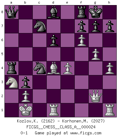Last move : 0-1 2007 November 11 19:5:3 [Event "FICGS__CHESS__CLASS_A__000024"] [Site "FICGS"] [Date "2007.06.30"] [Round "1"] [White "Kozlov,Konstantin"] [Black "Korhonen,Marko"] [Result "0-1"] [WhiteElo "2162"] [BlackElo "2027"] 1.e4 c5 2.Nf3 d6 3.d4 cxd4 4.Nxd4 Nf6 5.Nc3 a6 6.f3 e5 7.Nb3 Be6 8.Be3 Be7 9.Qd2 O-O 10.O-O-O Nbd7 11.g4 b5 12.g5 b4 13.Ne2 Ne8 14.f4 a5 15.f5 a4 16.Nbd4 exd4 17.Nxd4 b3 18.Kb1 bxc2+ 19.Nxc2 Bb3 20.axb3 axb3 21.Na3 Ne5 22.h4 Ra4 23.Qg2 Qa8 24.Bd4 Nc7 25.f6 Bd8 26.Bc4 Nxc4 0-1 Sicilian : Najdorf Kingside Castling by player Black (move 9) Queenside Castling by player White (move 10) Player Black won this chess game. Follow this game move after move (download)Chess is really ninety nine percent calculation. (Soltis) Das typische an einem Großmeister ist, daß er eine gewonnene Position schnell und schmerzlos gewinnt. (Irving Chernev) Alekhine es un poeta que crea un trabajo de arte de algo que raramente inspiraría a otra persona a mandar una tarjeta postal. (Max Euwe) Il s'avisa de me proposer d'apprendre les échecs qu'il jouait un peu... me voilà forcené des échecs. J'achète un échiquier, je m'enferme dans ma chambre, j'y passe des jours et des nuits à vouloir apprendre par cur toutes les parties. (Jean-Jacques Rousseau, Confessions) The meaning of life is that it is to be lived, and it is not to be traded and conceptualized and squeezed into a pattern of systems. (Bruce Lee)