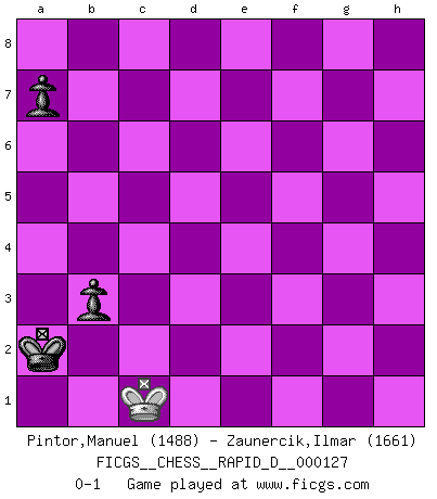 Last move : 0-1 2020 January 15 14:43:9 [Event "FICGS__CHESS__RAPID_D__000127"] [Site "FICGS"] [Date "2019.12.12"] [Round "1"] [White "Pintor,Manuel"] [Black "Zaunercik,Ilmar"] [Result "0-1"] [WhiteElo "1488"] [BlackElo "1661"] 1.e4 e5 2.f4 exf4 3.Nf3 g5 4.Bc4 d6 5.d4 g4 6.O-O gxf3 7.Qxf3 Qf6 8.c3 Nc6 9.Bxf4 Bd7 10.e5 dxe5 11.dxe5 Qg6 12.Bg3 Nh6 13.Nd2 O-O-O 14.Ne4 Nf5 15.Bd3 Qg7 16.Nf6 Bc5+ 17.Kh1 Nxg3+ 18.Qxg3 Qxg3 19.hxg3 Nxe5 20.Nxd7 Rxd7 21.Bf5 Rhd8 22.Rfe1 Ng6 23.Rad1 Bd6 24.c4 Nf8 25.Bxd7+ Nxd7 26.Kh2 Rg8 27.Rd3 Ne5 28.Rd4 Nxc4 29.Rxc4 Bxg3+ 30.Kh3 Bxe1 31.g4 Rg6 32.Rf4 f6 33.Re4 Bf2 34.Re8+ Kd7 35.Re4 Rg5 36.Rf4 Be3 37.Rxf6 Bd4 38.Rf7+ Kc6 39.b3 Rg7 40.Rf5 Re7 41.Kh4 h6 42.Kh5 Be3 43.b4 Kb6 44.a4 c5 45.Rf6+ Kc7 46.bxc5 Re5+ 47.Rf5 Rxf5+ 48.gxf5 Bg5 49.Kg6 Kc6 50.f6 Bxf6 51.Kxf6 Kxc5 52.Kg6 Kb4 53.Kxh6 Kxa4 54.Kg5 b5 55.Kf4 b4 56.Ke3 b3 57.Kd2 Ka3 58.Kc1 Ka2 0-1 KGA : King's knight's gambit Kingside Castling by player White (move 6) Queenside Castling by player Black (move 13) 10 pieces endgame at move 47 : White KPPP , Black KRBPPP WHITE : King + 3 Pawns BLACK : King + 1 Rook 1 Bishop 3 Pawns 9 pieces endgame at move 48 : White KPPP , Black KBPPP WHITE : King + 3 Pawns BLACK : King + 1 Bishop 3 Pawns 8 pieces endgame at move 50 : White KPP , Black KBPPP WHITE : King + 2 Pawns BLACK : King + 1 Bishop 3 Pawns 7 pieces endgame at move 51 : White KPP , Black KPPP WHITE : King + 2 Pawns BLACK : King + 3 Pawns 6 pieces endgame at move 51 : White KP , Black KPPP WHITE : King + 1 Pawn BLACK : King + 3 Pawns 5 pieces endgame at move 53 : White KP , Black KPP WHITE : King + 1 Pawn BLACK : King + 2 Pawns 4 pieces endgame at move 53 : White K , Black KPP WHITE : King + BLACK : King + 2 Pawns Player Black won this chess game. Follow this game move after move (download)Fischer, who may or may not be mad as a hatter, has every right to be horrified. (Jeremy Silman) Darum geht es im Schach. Einen Tag gibst du deinem Gegner eine Lektion, am nächsten Tag gibt er dir eine. (Robert James Fischer) El juego de Fischer siempre fue nítido, racional y brillante. Uno de los mejores por siempre. (Dave Regis) On entre au jeu d'Echecs comme on entre en Religion. Pour le joueur d'Echecs, la partie d'Echecs c'est l'office, la messe, le défilé du 1er Mai, le dépôt de gerbe au Monument aux Morts. C'est un drame sacré. (Michel Roos) The bottom line is always the bottom line. (Johann Piek)