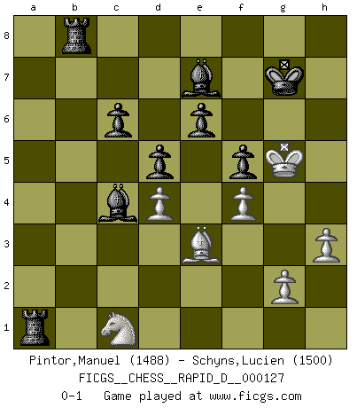 Last move : 0-1 2019 December 30 22:15:54 [Event "FICGS__CHESS__RAPID_D__000127"] [Site "FICGS"] [Date "2019.12.12"] [Round "1"] [White "Pintor,Manuel"] [Black "Schyns,Lucien"] [Result "0-1"] [WhiteElo "1488"] [BlackElo "1500"] 1.e4 c6 2.f4 d5 3.exd5 cxd5 4.d4 Nc6 5.Nf3 Bf5 6.Bb5 Qa5+ 7.Nc3 a6 8.Bxc6+ bxc6 9.O-O h5 10.Ne5 Rc8 11.a3 e6 12.Ne2 h4 13.h3 f6 14.Nf3 Ne7 15.Be3 Kf7 16.Bf2 Ng6 17.c3 Qb5 18.b4 a5 19.Qe1 Bd3 20.Ra2 Ra8 21.Nxh4 Nxh4 22.Bxh4 axb4 23.cxb4 Qc4 24.Rd2 Rxa3 25.Bf2 Bxb4 26.Qc1 Qxc1 27.Nxc1 Bxf1 28.Rb2 Ra1 29.Be3 Ba3 30.Rb7+ Kg6 31.Ra7 Bc4 32.Kf2 Rb8 33.Kg3 f5 34.Kh4 Bb4 35.Rxg7+ Kxg7 36.Kg5 Be7+ 0-1 Caro-Kann defense Kingside Castling by player White (move 9) Player Black won this chess game. Follow this game move after move (download)Even the laziest King flees wildly in the face of a double check ! (Aaron Nimzowitsch) Du musst nicht gut spielen, es reicht, wenn du besser spielst als dein Gegner. (Anonymous) Uno no tiene que jugar muy bien, es suficiente jugar mejor que el oponente. (Siegbert Tarrasch) Soyez une menace à chaque fois que vous vous asseyez pour jouer. (Ken Smith) Life is painting a picture, not doing a sum. (Oliver Wendell Holmes, Jr.)