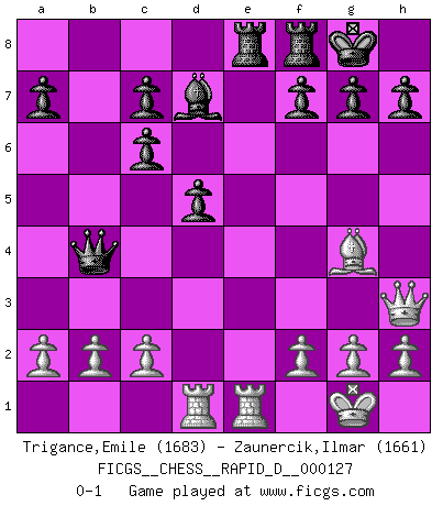 Last move : 0-1 2019 December 31 11:12:27 [Event "FICGS__CHESS__RAPID_D__000127"] [Site "FICGS"] [Date "2019.12.12"] [Round "1"] [White "Trigance,Emile"] [Black "Zaunercik,Ilmar"] [Result "0-1"] [WhiteElo "1683"] [BlackElo "1661"] 1.e4 e5 2.Nf3 Nc6 3.d4 exd4 4.Nxd4 Nf6 5.Nxc6 bxc6 6.e5 Ne4 7.Qf3 Ng5 8.Qg3 Ne6 9.Bd3 d5 10.O-O Nc5 11.Be2 Ne4 12.Qd3 Bc5 13.Nc3 Qh4 14.Be3 Bxe3 15.Qxe3 Nxc3 16.Qxc3 Bd7 17.Rad1 O-O 18.Rd4 Qg5 19.Re1 Qxe5 20.Bg4 Qd6 21.Qh3 Rae8 22.R4d1 Qb4 0-1 Scotch : Mieses variation Kingside Castling by player White (move 10) Kingside Castling by player Black (move 17) Player Black won this chess game. Follow this game move after move (download)When I asked Fischer why he had not played a certain move in our game, he replied: 'Well, you laughed when I wrote it down !' (Mikhail Tal) Ich möchte Schüler heranbilden, die das Vermögen haben, selbst zu denken und Kritik zu üben. (Emanuel Lasker) Repentinamente, me resultaba obvio en mi analisis que yo había pasado por alto lo que Fischer había visto en el tablero con la mas grande facilidad. (Mikhail Botvinnik) Aidez vos pièces, elles vous aideront. (Paul Morphy) We cannot be sure of having something to live for unless we are willing to die for it. (Ernesto Che Guevara)