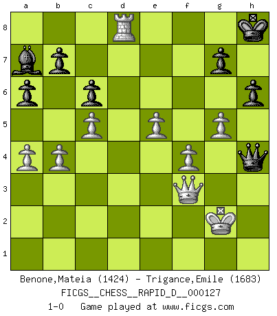 Last move : 1-0 2020 April 6 15:26:46 [Event "FICGS__CHESS__RAPID_D__000127"] [Site "FICGS"] [Date "2019.12.12"] [Round "1"] [White "Benone,Mateia"] [Black "Trigance,Emile"] [Result "1-0"] [WhiteElo "1424"] [BlackElo "1683"] 1.e4 e5 2.Nf3 f5 3.exf5 e4 4.Nd4 Nf6 5.d3 Bc5 6.dxe4 O-O 7.Nc3 Qe7 8.Bc4+ Kh8 9.O-O d6 10.Ne6 Bxe6 11.Bxe6 Nbd7 12.Bf4 a6 13.Nd5 Nxd5 14.Qxd5 c6 15.Qd3 Ne5 16.Qg3 Nf7 17.c3 Rad8 18.b4 Ba7 19.Rad1 Bb8 20.Rd3 Qf6 21.Bxf7 Qxf7 22.a4 Rd7 23.Rfd1 Rfd8 24.Bg5 d5 25.e5 Qxf5 26.Bxd8 Rxd8 27.f4 Qe4 28.Qf3 Qf5 29.g4 Qf7 30.h4 Qd7 31.c4 Ba7+ 32.Kg2 d4 33.c5 Qe7 34.Rxd4 Rxd4 35.Rxd4 Qxh4 36.g5 h6 37.Rd8+ 1-0 Latvian counter-gambit Kingside Castling by player Black (move 6) Kingside Castling by player White (move 9) Player White won this chess game. Follow this game move after move (download)The older I grow, the more I value Pawns. (Keres) Ich verstehe mehr vom Schach als irgendein anderer lebender Meister. (José Raúl Capablanca) ¿Esta Bobby Fischer algo cuerdo?. (Salo Flohr) Les pièces de l'échiquier étaient impitoyables. Elles le retenaient, elles l'absorbaient. Il y avait de l'horreur en cela, mais aussi une harmonie unique. Car, qu'y a-t-il dans le monde, à part les échecs ? (V. Nabokov) Life is the sum of all your choices. (Albert Camus)