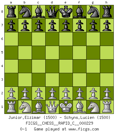 Last move : 0-1 2020 January 12 12:17:19 [Event "FICGS__CHESS__RAPID_C__000229"] [Site "FICGS"] [Date "2019.12.13"] [Round "1"] [White "Junior,Elzimar"] [Black "Schyns,Lucien"] [Result "0-1"] [WhiteElo "1500"] [BlackElo "1500"] 0-1 This chess game has been lost on time (started : 2019.12.13 1:8:33) Player Black won this chess game. Follow this game move after move (download)You need not play well - just help your opponent to play badly. (Genrikh Chepukaitis) Offensichtlich kennt Kasparow nichts anderes als Schach, und ich könnte 500 weitere Spieler dieser Sorte benennen. (Judith Polgar) El Ajedrez es una guerra en un tablero. El objetivo es aplastar la mente del oponente. (Bobby Fischer) Les Echecs représentent une sphère d'idées créatrices basée sur la volonté des deux protagonistes. (Smyslov) There is a very easy way to return from a casino with a small fortune : go there with a large one. (Jack Yelton)