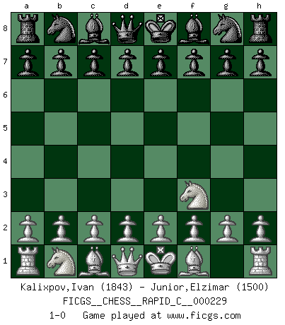 Last move : 1-0 2020 January 16 9:34:31 [Event "FICGS__CHESS__RAPID_C__000229"] [Site "FICGS"] [Date "2019.12.13"] [Round "1"] [White "Kalixpov,Ivan"] [Black "Junior,Elzimar"] [Result "1-0"] [WhiteElo "1843"] [BlackElo "1500"] 1.Nf3 1-0 This chess game has been lost on time (started : 2019.12.13 1:8:33) Reti Opening Player White won this chess game. Follow this game move after move (download)The winner of the game is the player who makes the next-to-last mistake. (Savielly Tartakover) Der Bart als Geschlechtszeichen mitten im Gesicht ist obszön. Daher gefällt er den Weibern. [Zugegeben, kein Schachzitat, aber unglaublich originell] (Arthur Schopenhauer) Algunos sacrificios son sólidos, los demás son míos. (Mikhail Tal) On n'a jamais que l'âge auquel on a commence à jouer aux échecs car après on cesse de vieillir. (Capablanca) A good book on your shelf is a friend that turns its back on you and remains a friend. (Author unknown)