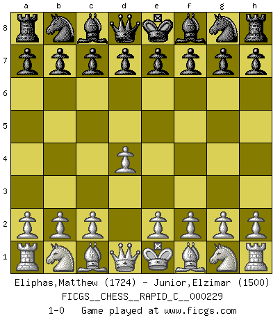 Last move : 1-0 2020 January 12 12:17:19 [Event "FICGS__CHESS__RAPID_C__000229"] [Site "FICGS"] [Date "2019.12.13"] [Round "1"] [White "Eliphas,Matthew"] [Black "Junior,Elzimar"] [Result "1-0"] [WhiteElo "1724"] [BlackElo "1500"] 1.d4 1-0 This chess game has been lost on time (started : 2019.12.13 1:8:33) Queen's pawn Player White won this chess game. Follow this game move after move (download)In Fischer's hands, a slight theoretical advantage is as good a being a Queen ahead. (Isaac Kashdan) Ich kenne keine einzige Person, die behaupten würde, Garri Kasparow sei ein guter Mensch (Nigel Short) Cada Peón es una Reina en potencia. (James Mason) Botvinnik disait en comparant les échecs à la musique: Il existe une science dont le but est l'étude de l'acoustique et des sons. Mais il y a aussi un art qui se sert de l'océan des sons : c'est la musique. De toute évidence, il en est de même pour la pensée. La logique est l'étude des lois de la réflexion et les échecs reflètent, en tant qu'art, le côté logique de la réflexion, sous la forme d'images artistiques... Extrait de Fischer - Spassky, Reykjavik 1972 par Alexander & F. Wyndham (Ed. Solar), p 37. Programmer - an organism that turns coffee into software. (Anonymous)