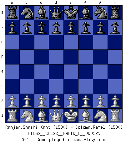 Last move : 0-1 2020 January 12 12:17:19 [Event "FICGS__CHESS__RAPID_C__000229"] [Site "FICGS"] [Date "2019.12.13"] [Round "1"] [White "Ranjan,Shashi Kant"] [Black "Coloma,Ramel"] [Result "0-1"] [WhiteElo "1500"] [BlackElo "1500"] 0-1 This chess game has been lost on time (started : 2019.12.13 1:8:33) Player Black won this chess game. Follow this game move after move (download)When I have White, I win because I am white; When I have Black, I win because I am Bogolyubov. (Bogolyubov) Bogoljubow: Matt in vier Zügen! Tartakower: Ich verbitte mir jede Belästigung! (Savielly Grigorievitsch Tartakower) Muchos se han convertido en Maestros de Ajedrez, nadie se ha convertido en el Maestro del Ajedrez. (Siegbert Tarrasch) La vérité est comme le meilleur coup aux échecs : elle existe, mais il faut la chercher. (Arturo Perez-Reverte) If you know the enemy and know yourself you need not fear the results of a hundred battles. (Sun Tzu)