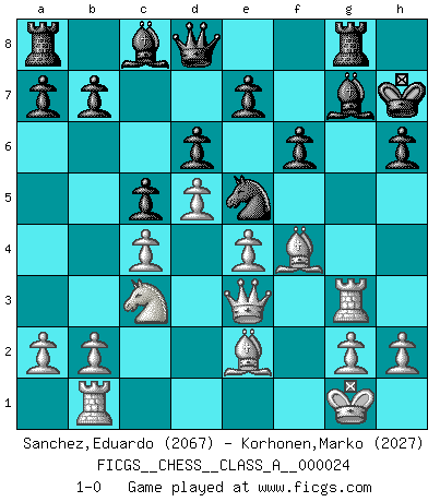 Last move : 1-0 2008 March 8 3:40:1 [Event "FICGS__CHESS__CLASS_A__000024"] [Site "FICGS"] [Date "2007.06.30"] [Round "1"] [White "Sanchez,Eduardo"] [Black "Korhonen,Marko"] [Result "1-0"] [WhiteElo "2067"] [BlackElo "2027"] 1.d4 Nf6 2.c4 g6 3.Nf3 Bg7 4.Nc3 O-O 5.e4 d6 6.Be3 Ng4 7.Bg5 h6 8.Bh4 c5 9.d5 Nd7 10.Be2 Qb6 11.Rb1 Ngf6 12.Nd2 g5 13.Bg3 Ne5 14.O-O Nfd7 15.f4 gxf4 16.Bxf4 Qd8 17.Nf3 Nxf3+ 18.Rxf3 Kh7 19.Qf1 f6 20.Rg3 Ne5 21.Qc1 Rg8 22.Qe3 1-0 King's Indian, 3.Nf3 Kingside Castling by player Black (move 4) Kingside Castling by player White (move 14) Player White won this chess game. Follow this game move after move (download)A big shock; the best chess player in history has passed away. (Lajos Portisch, about Bobby Fischer's death) Ich organisiere ein großes Turnier, was mich etwa 120000 Dollar kostet. Ich denke, das ist das erste Mal in der Schachgeschichte, daß ein Schachgroßmeister auch als Mäzen auftritt. (Miguel Najdorf) Si tu oponente no puede hacer nada activo, entonces no apures la posición; En vez de eso, dejalo estar sentado ahí, sufriendo y rogandote por un empate. (Jeremy Silman) La tactique, c'est ce que vous faites quand il y a quelque chose à faire; la stratégie, c'est ce que vous faites quand il n'y a rien à faire. (Savielli Tartacower) The smarter you play, the luckier you'll be. (Mark Pilarski)