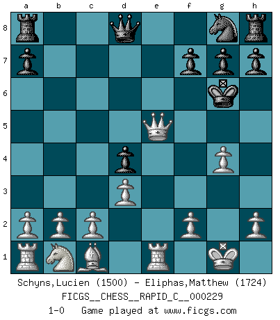 Last move : 1-0 2019 December 27 4:8:46 [Event "FICGS__CHESS__RAPID_C__000229"] [Site "FICGS"] [Date "2019.12.13"] [Round "1"] [White "Schyns,Lucien"] [Black "Eliphas,Matthew"] [Result "1-0"] [WhiteElo "1500"] [BlackElo "1724"] 1.e4 e6 2.Nf3 d5 3.Bd3 c5 4.Bb5+ Nc6 5.Qe2 Bd7 6.exd5 Nd4 7.Nxd4 cxd4 8.dxe6 Bxb5 9.Qxb5+ Ke7 10.Qxb7+ Kxe6 11.O-O Bd6 12.Re1+ Be5 13.Qc6+ Kf5 14.Qe4+ Kg5 15.Qxe5+ Kh6 16.d3 Kg6 17.g4 1-0 French defense Kingside Castling by player White (move 11) Player White won this chess game. Follow this game move after move (download)It's just you and your opponent at the board and you're trying to prove something. (Bobby Fischer) Ich spiele ehrlich und spiele, um zu gewinnen. Wenn ich verliere nehme ich meine Medizin. (Robert James Fischer) Con o sin el título, Bobby Fischer fue sin lugar a dudas el mas grande jugador de su época. (Burt Hochberg) Il s'avisa de me proposer d'apprendre les échecs qu'il jouait un peu... me voilà forcené des échecs. J'achète un échiquier, je m'enferme dans ma chambre, j'y passe des jours et des nuits à vouloir apprendre par cur toutes les parties. (Jean-Jacques Rousseau, Confessions) The meaning of life is that it is to be lived, and it is not to be traded and conceptualized and squeezed into a pattern of systems. (Bruce Lee)
