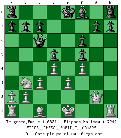 Last move : 1-0 2020 February 9 10:21:22 [Event "FICGS__CHESS__RAPID_C__000229"] [Site "FICGS"] [Date "2019.12.13"] [Round "1"] [White "Trigance,Emile"] [Black "Eliphas,Matthew"] [Result "1-0"] [WhiteElo "1683"] [BlackElo "1724"] 1.f4 d5 2.Nf3 Bg4 3.d4 Nc6 4.e3 Nf6 5.Nbd2 Bh5 6.Bb5 Ng4 7.Qe2 Qd7 8.h3 Nf6 9.g4 Nxg4 10.hxg4 Bxg4 11.Qg2 Bf5 12.c3 e6 13.Ne5 Qd6 14.Bd3 f6 15.Bxf5 exf5 16.Nxc6 Qxc6 17.Nb3 1-0 This chess game has been lost on time (started : 2019.12.13 1:8:33) Bird's Opening Player White won this chess game. Follow this game move after move (download)One bad move nullifies forty good ones. (Horowitz) Nicht daß Diemer aus Opportunismus Mitglied der NSDAP geworden wäre. Er war ein Fanatiker, in allem, was er tat. (Hans Ree) No hay precio que no valga la pena por la cabellera del Rey enemigo. (Koblentz) La tactique, c'est ce que vous faites quand il y a quelque chose à faire; la stratégie, c'est ce que vous faites quand il n'y a rien à faire. (Savielli Tartacower) Wisdom doesn't necessarily come with age. Sometimes age just shows up all by itself. (Tom Watson)