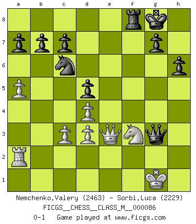 Last move : 0-1 2020 February 28 18:1:27 [Event "FICGS__CHESS__CLASS_M__000086"] [Site "FICGS"] [Date "2019.12.13"] [Round "1"] [White "Nemchenko,Valery"] [Black "Sorbi,Luca"] [Result "0-1"] [WhiteElo "2463"] [BlackElo "2229"] 1.e4 e5 2.Nf3 Nf6 3.Nxe5 d6 4.Nf3 Nxe4 5.d4 d5 6.Bd3 Nc6 7.Nc3 Nxc3 8.bxc3 Bd6 9.O-O O-O 10.Re1 Bg4 11.h3 Bh5 12.a4 Re8 13.g4 Bg6 14.Bg5 Rxe1+ 15.Qxe1 Qd7 16.a5 Bxd3 17.cxd3 f5 18.gxf5 Qxf5 19.Qe3 h6 20.Bh4 Qxh3 21.Ra2 Rf8 22.Bg3 Bxg3 23.fxg3 Qxg3+ 0-1 Petrov : Classical attack Kingside Castling by player White (move 9) Kingside Castling by player Black (move 9) Player Black won this chess game. Follow this game move after move (download)The King is a fighting piece. Use it ! (Wilhelm Steinitz) Ein Großmeister muß tausende Partien in seinem Kopf speichern, denn diese sind für Ihn, was die Worte der Muttersprache für gewöhnliche Leute sind, oder Noten für Musiker... (Garry Kasparov) El hombre es un frívolo, una creatura engañosa y como un jugador de Ajedrez, se preocupa mas por el proceso de obtener su meta que de la meta por sí misma. (Dostoyevsky) Le génie consiste à savoir transgresser les règles au moment opportun. (Teichmann) It's not enough to succeed. Others must fail. (Gore Vidal)
