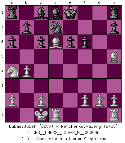 Last move : 1-0 2019 December 25 17:17:11 [Event "FICGS__CHESS__CLASS_M__000086"] [Site "FICGS"] [Date "2019.12.13"] [Round "1"] [White "Lubas,Jozef"] [Black "Nemchenko,Valery"] [Result "1-0"] [WhiteElo "2200"] [BlackElo "2463"] 1.e4 c5 2.Nf3 Nc6 3.d4 cxd4 4.Nxd4 Nf6 5.Nc3 a6 6.Nxc6 dxc6 7.Qxd8+ Kxd8 8.Bf4 e6 9.Be2 Bb4 10.O-O-O Ke7 11.Na4 Ba5 12.Bd6+ Ke8 13.Bf3 Nd7 14.e5 f6 15.exf6 gxf6 16.b4 Bd8 17.Bh5+ 1-0 Sicilian defense Queenside Castling by player White (move 10) Player White won this chess game. Follow this game move after move (download)Pawns are born free, yet they are everywhere in chains. (Rick Kennedy) Vom Schach wurde gesagt das Leben sei dafür nicht lange genug. Aber das ist der Fehler des Lebens, nicht des Schach'. (Irving Chernev) Aquellos que dicen entender al Ajedrez, no entienden nada. (Robert Hubner) A chaque perte on perd un peu de soi. (Joël Lautier) If only faces could talk... (Pat Summerall, Sportscaster during the Super Bowl)