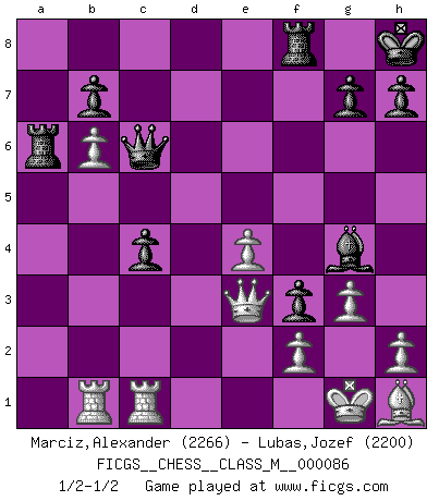 Last move : 1/2-1/2 2019 December 24 11:33:31 [Event "FICGS__CHESS__CLASS_M__000086"] [Site "FICGS"] [Date "2019.12.13"] [Round "1"] [White "Marciz,Alexander"] [Black "Lubas,Jozef"] [Result "1/2-1/2"] [WhiteElo "2266"] [BlackElo "2200"] 1.e4 c5 2.Nc3 a6 3.Nf3 d6 4.g3 Nc6 5.Bg2 e6 6.O-O Nf6 7.d4 cxd4 8.Nxd4 Bd7 9.Nxc6 Bxc6 10.a4 Be7 11.a5 O-O 12.Be3 Nd7 13.Na4 f5 14.Nb6 Nxb6 15.Bxb6 Qd7 16.Qd3 f4 17.b4 e5 18.c4 Kh8 19.Rab1 Qc8 20.b5 Bd7 21.bxa6 Rxa6 22.c5 dxc5 23.Qd5 f3 24.Bh1 Bd8 25.Qxe5 Bxb6 26.axb6 c4 27.Rfc1 Qc6 28.Qd4 Be6 29.Qe3 Bg4 1/2-1/2 Sicilian : Closed Kingside Castling by player White (move 6) Kingside Castling by player Black (move 11) This chess game ended in a draw. Follow this game move after move (download)All I want to do, ever, is just play Chess. (Bobby Fischer) Ich trinke, ich rauche, ich spiele, ich liebe Frauen aber Fernschach ist ein Laster, das ich nicht habe. (Mikhail Nekhemyevich Tal) El Ajedrez es un regaderazo frío para la mente. (Sir John Simon) En blitz, le Cavalier l'emporte sur le Fou. (Vlastimil Hort) Follow your passion, and success will follow you. (Arthur Buddhold)