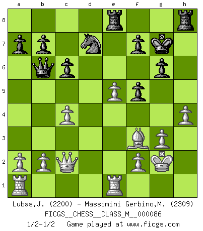 Last move : 1/2-1/2 2020 January 17 16:20:26 [Event "FICGS__CHESS__CLASS_M__000086"] [Site "FICGS"] [Date "2019.12.13"] [Round "1"] [White "Lubas,Jozef"] [Black "Massimini Gerbino,Massimiliano"] [Result "1/2-1/2"] [WhiteElo "2200"] [BlackElo "2309"] 1.e4 d5 2.exd5 Qxd5 3.Nc3 Qa5 4.d4 Nf6 5.Nf3 c6 6.Bc4 Bf5 7.Bd2 e6 8.Nd5 Qd8 9.Nxf6+ gxf6 10.O-O Nd7 11.Nh4 Bg6 12.c3 Bg7 13.Re1 O-O 14.Nxg6 hxg6 15.g3 Kh7 16.h4 Bh6 17.Kg2 f5 18.Be2 Rh8 19.Bxh6 Kxh6 20.Qb3 Qb6 21.Qc2 Kg7 22.Bf3 Rae8 23.c4 e5 24.dxe5 1/2-1/2 Scandinavian (centre counter) defense Kingside Castling by player White (move 10) Kingside Castling by player Black (move 13) This chess game ended in a draw. Follow this game move after move (download)Daring ideas are like Chess men moved forward. They may be beaten, but they may start a winning game. (Johann Wolfgang von Goethe) Schach sollte überall auf der Welt Schulfach werden. Es fördert die geistige Auseinandersetzung. Es lehrt die Demut in der Niederlage. (Garry Kasparov) Es el objetivo de la escuela moderna no tratar cada posición de acuerdo a una regla general, sino de acuerdo al principio inherente en la posición. (Richard Reti) Je ne suis pas le dernier à jouer lâchement des coups douteux pendant le zeïtnot de l'adversaire pour l'achever: en effet les coups qui font le plus peur sont ceux que l'on ne comprend pas. Je me fais souvent peur quand je joue. (Un professeur anonyme) Every man's memory is his private literature. (Aldous Huxley)