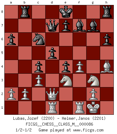 Last move : 1/2-1/2 2020 April 15 20:16:43 [Event "FICGS__CHESS__CLASS_M__000086"] [Site "FICGS"] [Date "2019.12.13"] [Round "1"] [White "Lubas,Jozef"] [Black "Helmer,Janos"] [Result "1/2-1/2"] [WhiteElo "2200"] [BlackElo "2201"] 1.e4 c5 2.Nf3 d6 3.d4 cxd4 4.Nxd4 Nf6 5.Nc3 a6 6.Nb3 Nc6 7.Be3 Ng4 8.Bg5 h6 9.Bh4 g5 10.Bg3 Bg7 11.Qd2 b5 12.h4 gxh4 13.Bxh4 Nge5 14.Nd5 Nc4 15.Bxc4 bxc4 16.Nc1 Rb8 17.c3 Be6 18.f4 Qd7 19.Ne3 f5 20.Ne2 fxe4 21.O-O Bf7 22.Ng3 d5 23.Rad1 1/2-1/2 Sicilian : Najdorf Kingside Castling by player White (move 21) This chess game ended in a draw. Follow this game move after move (download)Chess opens and enriches your mind. (Saudin Robovic) Es gibt nur zwei wahre Schachgenies - das andere war Wilhelm Steinitz, der Weltmeister von 1872 bis 1894. (Robert James Fischer) Fischer era un maestro de claridad y un Rey del posicionamiento astuto. Sus oponentes podían ver hacia donde se dirigía pero eran impotentes para detenerlo. (Bruce Pandolfini) C'est une question de caractère, Beaucoup de gens perdent leur motivation très vite. D'autres, ils sont rares, peuvent la conserver très longtemps. J'aime les échecs, encore aujourd'hui je suis heureux d'analyser des parties. J'aime toujours gagner, je déteste encore perdre. Bien jouer est important pour mon intégrité intellectuelle et morale. Et puis les échecs vivent en ce moment une période historique grâce à Internet. Ils se développent dans les systèmes éducatifs à travers le monde. Ils sortent de leur ghetto, et c'est mon rôle de mener à bien cette révolution. (Gary Kasparov) Those who make the worst use of their time are the first to complain of its brevity. (Jean de la Bruyere)