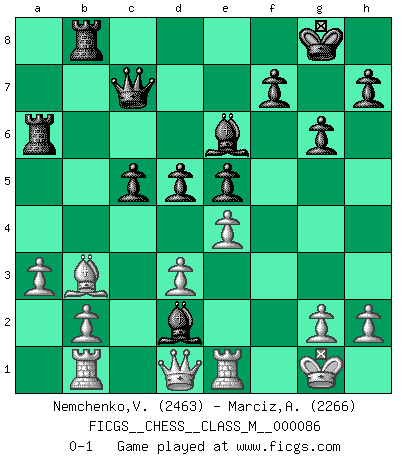 Last move : 0-1 2019 December 25 19:42:27 [Event "FICGS__CHESS__CLASS_M__000086"] [Site "FICGS"] [Date "2019.12.13"] [Round "1"] [White "Nemchenko,Valery"] [Black "Marciz,Alexander"] [Result "0-1"] [WhiteElo "2463"] [BlackElo "2266"] 1.e4 c5 2.Nf3 Nc6 3.Bb5 g6 4.Nc3 Bg7 5.O-O e5 6.d3 Nge7 7.Be3 d6 8.Nd5 O-O 9.c3 Nxd5 10.exd5 Ne7 11.c4 a6 12.Ba4 b5 13.cxb5 Nxd5 14.Re1 Qc7 15.Nd2 Be6 16.Nc4 Rfb8 17.bxa6 Rxa6 18.Bb3 Nb4 19.a3 Nd5 20.Rb1 Nxe3 21.fxe3 d5 22.Nd2 Bh6 23.e4 Bxd2 0-1 Sicilian : Nimzovich-Rossolimo attack (with ...g6, without ...d6) Kingside Castling by player White (move 5) Kingside Castling by player Black (move 8) Player Black won this chess game. Follow this game move after move (download)Blessed be the memory of him who gave the world this immortal game. (A. G. Gardiner) Ich verachte Kasparow. (Viktor Kortschnoi) Fischer deseaba darle a los Rusos una sopa de su propia medicina. (Larry Evans) Si je n'étais pas joueur d'échecs, je serais le meilleur dans quelque chose d'autre. (Anatoli Karpov) The message for business people contemplating their place in the cyberspace is simple and direct: get linked or get lost. (Vic Sussman and Kenan Pollack)