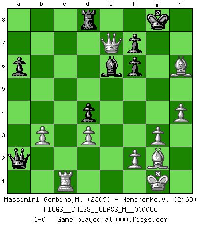 Last move : 1-0 2020 January 21 18:44:49 [Event "FICGS__CHESS__CLASS_M__000086"] [Site "FICGS"] [Date "2019.12.13"] [Round "1"] [White "Massimini Gerbino,Massimiliano"] [Black "Nemchenko,Valery"] [Result "1-0"] [WhiteElo "2309"] [BlackElo "2463"] 1.c4 e5 2.Nc3 Nf6 3.Nf3 Nc6 4.g3 Be7 5.Bg2 O-O 6.d4 exd4 7.Nxd4 Nxd4 8.Qxd4 Bb4 9.Bg5 Be7 10.Rd1 h6 11.Bf4 d6 12.b3 a6 13.O-O Rb8 14.Qa7 Nd7 15.Rd3 Nc5 16.Qxb8 Nxd3 17.exd3 c6 18.Ne4 d5 19.cxd5 cxd5 20.Nc3 d4 21.Nd5 Bf6 22.h4 Qa5 23.Nxf6+ gxf6 24.Rc1 Be6 25.Qxb7 Qxa2 26.Bxh6 Rd8 27.Qe7 1-0 English Opening Kingside Castling by player Black (move 5) Kingside Castling by player White (move 13) Player White won this chess game. Follow this game move after move (download)Fischer wanted to give the Russians a taste of their own medicine. (Larry Evans) Mit Schach schule ich mein Gefühl für Geometrie, was für Tennis und Schach gleichermaßen wichtig ist. (Boris Becker) Nos gusta pensar. (Gary Kasparov) Tous ces prétendus hommes politiques sont les pions, les Cavaliers, les Tours ou les Fous d'une partie d'échecs qui se jouera tant qu'un hasard ne renversera pas l'échiquier. (Honoré de Balzac) A specialist learns more and more about less and less until he knows everything about nothing. (Nicholas Murray Butler)