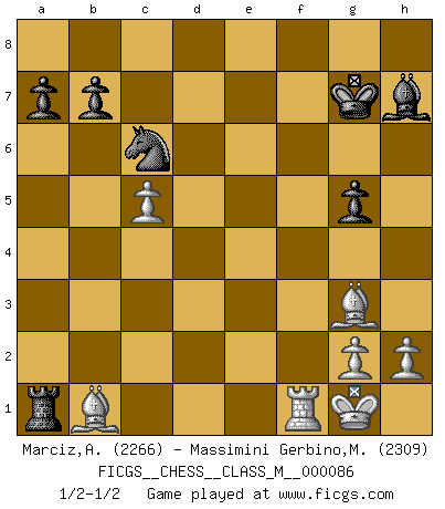 Last move : 1/2-1/2 2020 February 22 14:58:25 [Event "FICGS__CHESS__CLASS_M__000086"] [Site "FICGS"] [Date "2019.12.13"] [Round "1"] [White "Marciz,Alexander"] [Black "Massimini Gerbino,Massimiliano"] [Result "1/2-1/2"] [WhiteElo "2266"] [BlackElo "2309"] 1.d4 Nf6 2.c4 e6 3.Nc3 Bb4 4.f3 d5 5.a3 Bxc3+ 6.bxc3 c5 7.cxd5 Nxd5 8.dxc5 Qa5 9.e4 Ne7 10.Be3 O-O 11.Qb3 Qc7 12.Bb5 Nec6 13.Ne2 Na5 14.Qb4 e5 15.Nd4 Nbc6 16.Qb2 exd4 17.cxd4 Bd7 18.O-O Rae8 19.Bf2 f5 20.Bd3 Qd8 21.Qc3 h6 22.Bb1 fxe4 23.fxe4 Bg4 24.Ba2+ Kh8 25.d5 Be2 26.Rfe1 Rxe4 27.dxc6 Nxc6 28.Rad1 Qg5 29.Rd5 Qf4 30.Qg3 Ba6 31.Qxf4 Rxe1+ 32.Bxe1 Rxf4 33.Bf2 Ra4 34.Rf5 g5 35.Rf3 Bc4 36.Bb1 Bd5 37.Rf5 Bg8 38.Rf6 Kg7 39.Rg6+ Kf8 40.Rxh6 Rxa3 41.Bg3 Ra1 42.Rf6+ Kg7 43.Rf1 Bh7 1/2-1/2 Nimzo-Indian : Kmoch variation Kingside Castling by player Black (move 10) Kingside Castling by player White (move 18) This chess game ended in a draw. Follow this game move after move (download)A thorough understanding of the typical mating continuations makes the most complicated sacrificial combinations leading up to them not only not difficult, but almost a matter of course. (Siegbert Tarrasch) Gewinnen beim Schach fördert das Selbstvertrauen. Beim Sex spüre ich sowas nicht... (Garry Kasparov) El Ajedrez, como cualquier otra actividad creativa, puede existir solo a través de méritos combinados de aquellos que tienen talento creativo y de aquellos que tienen la habilidad de organizar un trabajo creativo. (Mikhail Botvinnik) Votre seul travail dans les ouvertures est d'obtenir un milieu de partie jouable. (Lajos Portish) Experience is the name we all give to our mistakes. (Oscar Wilde)