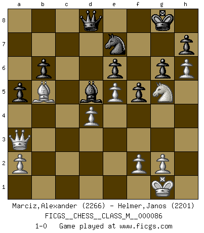 Last move : 1-0 2020 May 6 19:44:10 [Event "FICGS__CHESS__CLASS_M__000086"] [Site "FICGS"] [Date "2019.12.13"] [Round "1"] [White "Marciz,Alexander"] [Black "Helmer,Janos"] [Result "1-0"] [WhiteElo "2266"] [BlackElo "2201"] 1.d4 Nf6 2.c4 g6 3.Nc3 d5 4.cxd5 Nxd5 5.e4 Nxc3 6.bxc3 Bg7 7.Bc4 c5 8.Ne2 Nc6 9.Be3 O-O 10.O-O cxd4 11.cxd4 Na5 12.Bd3 b6 13.Rc1 e6 14.Qd2 Bb7 15.h4 Qd7 16.h5 Rfc8 17.Bh6 Rxc1 18.Rxc1 Bxh6 19.Qxh6 Rc8 20.Rxc8+ Qxc8 21.Qf4 Qd8 22.h6 f6 23.e5 f5 24.Qe3 Bd5 25.Nf4 Nc6 26.Bb5 Kf7 27.Qc3 Ne7 28.Nh3 Kg8 29.Qa3 a5 30.Ng5 1-0 This chess game has been lost on time (started : 2019.12.13 16:11:9) King's Indian defense, 3.Nc3 Kingside Castling by player Black (move 9) Kingside Castling by player White (move 10) Player White won this chess game. Follow this game move after move (download)Chess is mental torture. (Garry Kasparov) Stelle das Brett so, daß die Sonne in die Augen deines Gegners scheint. (Ruy López) Bendita sea la memoria de aquel que dio al mundo este juego inmortal. (A. G. Gardiner) Les échecs c'est le défi de l'alpiniste, toujours plus haut, prêt à tout pour monter à l'assaut du Roi ennemi. Les échecs, c'est de la musique en mouvement, un ballet majestueux pour les yeux. C'est de la poésie composée par les fantômes du passé qui au même titre que Rimbaud ou Verlaine méritent notre admiration. Les échecs, c'est de la peinture ou le moindre mouvement modifie le tableau pour en faire un Picasso ou un Van Gogh. Les échecs, c'est tout et rien, c'est la vie et la mort. Jjulie33 sur le forum de France-Echecs. Political correctness is subjecting us to gross incompetence. (Johann Piek)