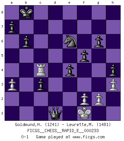 Last move : 0-1 2020 January 23 12:39:30 [Event "FICGS__CHESS__RAPID_E__000233"] [Site "FICGS"] [Date "2019.12.13"] [Round "1"] [White "Goldmund,Heike"] [Black "Leurette,Marc-Antoine"] [Result "0-1"] [WhiteElo "1241"] [BlackElo "1481"] 1.Nf3 d5 2.e3 Nc6 3.c4 d4 4.exd4 Nxd4 5.Nxd4 Qxd4 6.Qe2 e5 7.Nc3 Bd7 8.b3 O-O-O 9.Bb2 f6 10.Na4 Qd6 11.Qe3 Bxa4 12.bxa4 Qb4 13.Qc3 Qxa4 14.Be2 Bb4 15.Qh3+ Kb8 16.Qe3 Bxd2+ 17.Qxd2 Rxd2 18.Kxd2 Ne7 19.Rhb1 Rd8+ 20.Ke1 Nc6 21.a3 Qc2 22.Rc1 Qxb2 23.Rcb1 Qd2+ 24.Kf1 Nd4 25.Bd1 Qd3+ 26.Kg1 c5 27.h3 h5 28.Rb2 h4 29.Rab1 b6 30.Bg4 g6 31.Rd1 Qxc4 32.R1d2 f5 33.Bd1 Qc1 34.Kf1 e4 35.Ke1 c4 36.Rb4 Nc6 37.Rxd8+ Nxd8 38.Ke2 c3 39.Rd4 Ne6 40.Rc4 Qd2+ 41.Kf1 Qxd1+ 0-1 Reti Opening Queenside Castling by player Black (move 8) Player Black won this chess game. Follow this game move after move (download)Chess is 99 percent tactics. (Teichmann) Obwohl ich alt bin, darf mir niemand den Finger in den Mund stecken, sonst beisse ich. (Wilhelm Steinitz) En la perfecta combinación de Ajedrez como en una historia corta de primera clase, toda la trama y contra trama deberá conducir hacia un final sorprendente, el interes no es mitigado hasta el último momento. (Yates and Winter) L'attaque fait le spectacle, la défense gagne les matchs. (Dicton footballistique) Nobody is always a winner, and anybody who says he is, is either a liar or doesn't play poker. (Amarillo Slim)