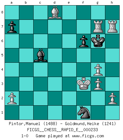 Last move : 1-0 2020 February 3 9:40:33 [Event "FICGS__CHESS__RAPID_E__000233"] [Site "FICGS"] [Date "2019.12.13"] [Round "1"] [White "Pintor,Manuel"] [Black "Goldmund,Heike"] [Result "1-0"] [WhiteElo "1488"] [BlackElo "1241"] 1.e4 d5 2.exd5 Qxd5 3.d4 e5 4.Nf3 Bg4 5.Nc3 Qd6 6.d5 Nf6 7.Bc4 Nbd7 8.O-O Be7 9.Qd3 Nb6 10.Bb5+ c6 11.dxc6 bxc6 12.Qxd6 Bxd6 13.Bxc6+ Ke7 14.Bxa8 Rxa8 15.Nd2 Bf5 16.f3 Bxc2 17.Re1 Nfd5 18.Nxd5+ Nxd5 19.Nc4 Bc7 20.Nxe5 Kf8 21.Nd7+ Kg8 22.Bd2 Rd8 23.Ne5 f6 24.Ng4 Nb6 25.Ba5 Bb8 26.Rac1 Bf5 27.Re7 Kf8 28.Rce1 Bxg4 29.fxg4 Rc8 30.Bb4 Nd5 31.Re8+ Kf7 32.Rxc8 Be5 33.Rf8+ Kg6 34.Ba3 Nf4 35.g3 Nd3 36.Rd1 Nxb2 37.Rd7 Nc4 38.Be7 Nb6 39.Rb7 Nd5 40.Bd8 Bd6 41.Rg8 Bc5+ 42.Kg2 Ne3+ 43.Kf3 Nf1 44.R8xg7+ Kh6 45.Rxh7+ Kg6 46.Rbg7+ 1-0 Scandinavian (centre counter) defense Kingside Castling by player White (move 8) Player White won this chess game. Follow this game move after move (download)Chess is a fairy tale of 1001 blunders. (Savielly Tartakower) Im Schach nämlich geht es darum, daß Ich des Gegners klein zu kriegen, sein Ego zu zerbrechen und zu zermahlen, seine Selbstachtung zu zertreten und zu verscharren und seine ganze mißachtenswerte sogenannte Persönlichkeit ein für alle Mal tot zu hacken und zu zerstampfen und dadurch die menschliche Gesellschaft von einer stinkenden Pestbeule zu befreien. Es ist ein königliches Spiel. (Robert James Fischer) Todo lo que importa ante el tablero de Ajedrez son buenas jugadas. (Bobby Fischer) Votre seul travail dans les ouvertures est d'obtenir un milieu de partie jouable. (Lajos Portish) A proverb is a short sentence based on long experience. (Miguel de Cervantes)