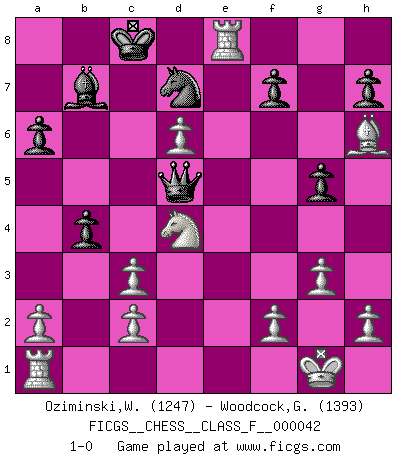 Last move : 1-0 2007 September 25 18:8:33 [Event "FICGS__CHESS__CLASS_F__000042"] [Site "FICGS"] [Date "2007.06.30"] [Round "1"] [White "Oziminski,Wojciech"] [Black "Woodcock,Graham"] [Result "1-0"] [WhiteElo "1247"] [BlackElo "1393"] 1.e4 c5 2.Nc3 a6 3.g3 g6 4.Bg2 Bg7 5.d3 Bxc3+ 6.bxc3 Qa5 7.Ne2 Nf6 8.O-O d6 9.d4 b5 10.e5 Ra7 11.exf6 exf6 12.Bh6 Rg8 13.Re1 Kd8 14.dxc5 Rd7 15.Bh3 f5 16.cxd6 g5 17.Bxf5 b4 18.Bxd7 Nxd7 19.Nd4 Bb7 20.Qe2 Qd5 21.Qe7+ Kc8 22.Qe8+ Rxe8 23.Rxe8+ 1-0 Sicilian : Closed Kingside Castling by player White (move 8) Player White won this chess game. Follow this game move after move (download)There's never before been a Chess player with such a thorough knowledge of the intricacies of the game and such an absolutely indomitable will to win. I think Bobby is the greatest player that ever lived. (Lisa Lane) Das ganze Leben mit einer Ehefrau ist wie ein Endspiel mit ungleichfarbigen Läufern. (Viktor Kortschnoi) La belleza de un movimiento no se refleja solo en su apariencia, sino en el pensamiento detrás de él. (Siegbert Tarrasch) Je ne crois pas en la psychologie, je crois aux bons coups. (Robert Fischer) A belief is an idea the mind possesses, an idea that possesses the mind. (Robert Oxden Bolton)