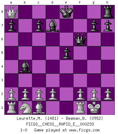 Last move : 1-0 2019 December 17 19:0:57 [Event "FICGS__CHESS__RAPID_E__000233"] [Site "FICGS"] [Date "2019.12.13"] [Round "1"] [White "Leurette,Marc-Antoine"] [Black "Beeman,Brett"] [Result "1-0"] [WhiteElo "1481"] [BlackElo "0952"] 1.e4 e5 2.Nf3 Nc6 3.Bc4 Nf6 4.Ng5 d5 5.exd5 Nxd5 6.Nxf7 Kxf7 7.Qf3+ Ke8 8.Bxd5 Qg5 9.Bxc6+ bxc6 10.Qxc6+ Bd7 11.Qxa8+ Qd8 12.Qf3 Bb4 13.O-O Qf6 14.Qa8+ 1-0 Two knights defense : Fegatello attack Kingside Castling by player White (move 13) Player White won this chess game. Follow this game move after move (download)Chess is really ninety nine percent calculation. (Soltis) Gott hat gewollt, dass ich Champion werde. (Surab Azmajparaschvili) Aquellos que dicen que entienden al Ajedrez, no entienden nada. (Robert Hubner) Le moment que je préfère le plus dans une rencontre, c'est celui où je sens que la personnalité de l'adversaire se brise. (Robert Fischer) If you lose the game you should win the analysis! (Proverb)