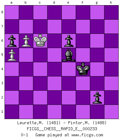 Last move : 0-1 2020 January 6 14:22:21 [Event "FICGS__CHESS__RAPID_E__000233"] [Site "FICGS"] [Date "2019.12.13"] [Round "1"] [White "Leurette,Marc-Antoine"] [Black "Pintor,Manuel"] [Result "0-1"] [WhiteElo "1481"] [BlackElo "1488"] 1.e4 e5 2.Nf3 Nc6 3.Bc4 Bc5 4.O-O Qf6 5.d3 d6 6.c3 Bg4 7.Nbd2 Qg6 8.h3 Bxh3 9.Nh4 Qg3 10.Qf3 Qxf3 11.Ndxf3 Be6 12.Bxe6 fxe6 13.b4 Bb6 14.a4 a6 15.a5 Ba7 16.Bd2 Nf6 17.g3 O-O 18.Kg2 h6 19.Ng6 Rf7 20.c4 Nd4 21.Nxd4 Bxd4 22.Rac1 Kh7 23.Nh4 g6 24.Nf3 Ba7 25.Rh1 Nh5 26.g4 Nf4+ 27.Bxf4 Rxf4 28.Kg3 Raf8 29.Ng5+ Kg8 30.Rxh6 Bxf2+ 31.Kh3 R4f6 32.Kg2 Be3 33.Rch1 Bxg5 34.Rh8+ Kf7 35.R1h7+ Ke8 36.Rxf8+ Kxf8 37.Rxc7 Rf7 38.Rc8+ Kg7 39.b5 Rd7 40.b6 Bd8 41.Kf3 Kf6 42.Ke3 Kg5 43.Kf3 Kh4 44.Ra8 Kh3 45.Rc8 Kh2 46.Ra8 Rf7+ 47.Ke2 Rd7 48.Kf3 Bh4 49.Rc8 Rf7+ 50.Ke3 Kg3 51.Rc7 Re7 52.Rxe7 Bxe7 53.d4 exd4+ 54.Kxd4 Kxg4 55.e5 Kf4 56.exd6 Bxd6 57.c5 Be5+ 58.Kd3 g5 59.Kc4 g4 60.c6 bxc6 61.Kc5 g3 62.Kxc6 g2 0-1 Giuoco Piano Kingside Castling by player White (move 4) Kingside Castling by player Black (move 17) 10 pieces endgame at move 56 : White KPPP , Black KBPPPP WHITE : King + 3 Pawns BLACK : King + 1 Bishop 4 Pawns 9 pieces endgame at move 60 : White KPP , Black KBPPPP WHITE : King + 2 Pawns BLACK : King + 1 Bishop 4 Pawns 8 pieces endgame at move 62 : White KPP , Black KBPPP WHITE : King + 2 Pawns BLACK : King + 1 Bishop 3 Pawns Player Black won this chess game. Follow this game move after move (download)Every Pawn is a potential Queen. (James Mason) Schach ist Kampf, hauptsächlich jedoch gegen die eigenen Fehler. (Savielly Grigorievitsch Tartakower) Los Peones son el alma de una partida de Ajedrez. (Francois Andre Danican Philidor) C'est la seule position que je connaisse où les deux camps sont mals. Propos prêtés à V. Anand. Do not put your faith in what statistics say until you have carefully considered what they do not say. (William W. Watt)