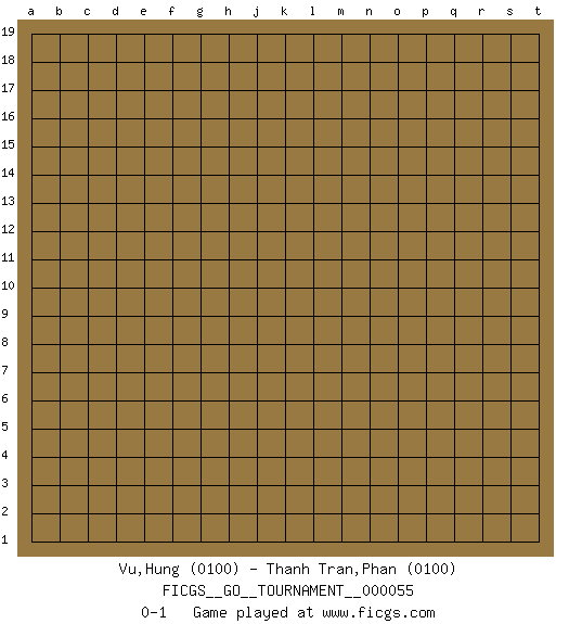 Last move : 0-1 2020 January 13 15:7:55 [Event "FICGS__GO__TOURNAMENT__000055"] [Site "FICGS"] [Date "2019.12.14"] [Round "1"] [Black "Vu,Hung"] [White "Thanh Tran,Phan"] [Result "0-1"] [Rating 1 "0100"] [Rating 2 "0100"] 0-1 This go game has been lost on time (started : 2019.12.14 13:40:28) Here are the names of the openings (joseki) played in the four corners : Player White won this Go (weiqi, baduk) game. Follow this game move after move (download)Everything happens on a grid-engraved board with black and white pieces, but if that's all you see then you don't know Go. (Pierre Audouard) You must do what you feel is right... of course. (Obi-Wan Kenobi in Star Wars ep.4)
