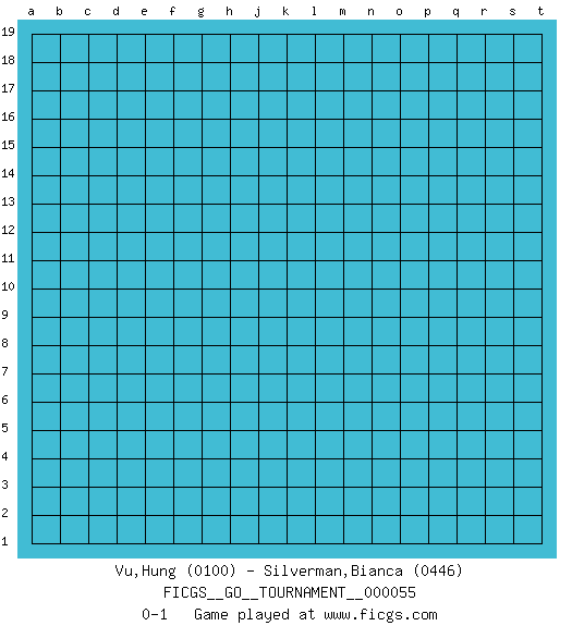 Last move : 0-1 2020 January 13 15:7:55 [Event "FICGS__GO__TOURNAMENT__000055"] [Site "FICGS"] [Date "2019.12.14"] [Round "1"] [Black "Vu,Hung"] [White "Silverman,Bianca"] [Result "0-1"] [Rating 1 "0100"] [Rating 2 "0446"] 0-1 This go game has been lost on time (started : 2019.12.14 13:40:28) Here are the names of the openings (joseki) played in the four corners : Player White won this Go (weiqi, baduk) game. Follow this game move after move (download)Studying go is a wonderful way to develop both the creative as well as the logical abilities of children because to play it both sides of the brain are necessary. (Cho Chikun) Mac users swear by their computers. PC users swear at their computers. (Author unknown)