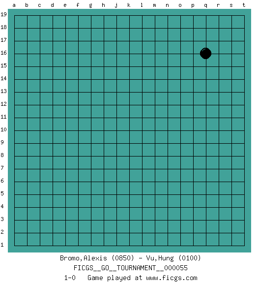 Last move : 1-0 2020 January 13 15:7:55 [Event "FICGS__GO__TOURNAMENT__000055"] [Site "FICGS"] [Date "2019.12.14"] [Round "1"] [Black "Bromo,Alexis"] [White "Vu,Hung"] [Result "1-0"] [Rating 1 "0850"] [Rating 2 "0100"] 1.q16 1-0 This go game has been lost on time (started : 2019.12.14 13:40:28) Here are the names of the openings (joseki) played in the four corners : Player Black won this Go (weiqi, baduk) game. Follow this game move after move (download)There is damezumari at the bamboo joint. (Anonymous) Be who you are, and say what you feel because those who mind don't matter, and those who matter don't mind. (Dr Seuss)