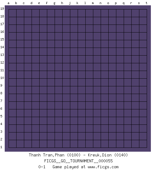 Last move : 0-1 2020 January 13 15:7:55 [Event "FICGS__GO__TOURNAMENT__000055"] [Site "FICGS"] [Date "2019.12.14"] [Round "1"] [Black "Thanh Tran,Phan"] [White "Kreuk,Dion"] [Result "0-1"] [Rating 1 "0100"] [Rating 2 "0140"] 0-1 This go game has been lost on time (started : 2019.12.14 13:40:28) Here are the names of the openings (joseki) played in the four corners : Player White won this Go (weiqi, baduk) game. Follow this game move after move (download)On the second line six die, eight live. (Anonymous) At last I discovered the true beauty of chess. So I proposed to her. (Dinesh De Silva)