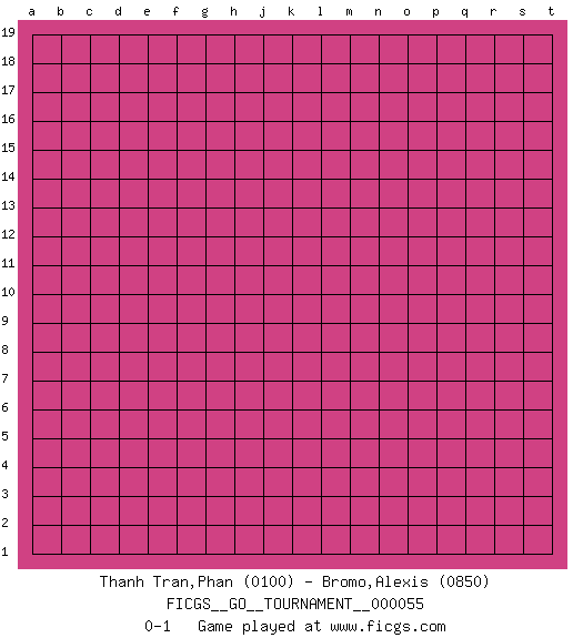 Last move : 0-1 2020 January 13 15:7:55 [Event "FICGS__GO__TOURNAMENT__000055"] [Site "FICGS"] [Date "2019.12.14"] [Round "1"] [Black "Thanh Tran,Phan"] [White "Bromo,Alexis"] [Result "0-1"] [Rating 1 "0100"] [Rating 2 "0850"] 0-1 This go game has been lost on time (started : 2019.12.14 13:40:28) Here are the names of the openings (joseki) played in the four corners : Player White won this Go (weiqi, baduk) game. Follow this game move after move (download)Beginner's games are surprising, often incoherent and incomprehensible. When you improve, your game gains in consistency but flirts with stupidity: you become satisfied with truisms and mechanical movements, you try to obtain a feeling for clearness and style the easy way. (Pierre Audouard) The various flowers seem good to different people. (Chinese proverb)