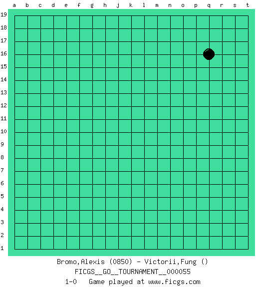 Last move : 1-0 2020 January 13 15:7:55 [Event "FICGS__GO__TOURNAMENT__000055"] [Site "FICGS"] [Date "2019.12.14"] [Round "1"] [Black "Bromo,Alexis"] [White "Victorii,Fung"] [Result "1-0"] [Rating 1 "0850"] 1.q16 1-0 This go game has been lost on time (started : 2019.12.14 13:40:28) Here are the names of the openings (joseki) played in the four corners : Player Black won this Go (weiqi, baduk) game. Follow this game move after move (download)The monkey jump is worth eight points. (Anonymous) O divine art of subtlety and secrecy! Through you we learn to be invisible, through you inaudible and hence we can hold the enemy's fate in our hands. (Sun Tzu)