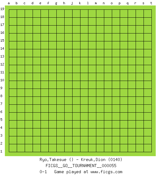Last move : 0-1 2020 January 13 15:7:55 [Event "FICGS__GO__TOURNAMENT__000055"] [Site "FICGS"] [Date "2019.12.14"] [Round "1"] [Black "Ryo,Takesue"] [White "Kreuk,Dion"] [Result "0-1"] [Rating 2 "0140"] 0-1 This go game has been lost on time (started : 2019.12.14 13:40:28) Here are the names of the openings (joseki) played in the four corners : Player White won this Go (weiqi, baduk) game. Follow this game move after move (download)In the corner, five stones in a row on the third line are alive. (Anonymous) If only faces could talk... (Pat Summerall, Sportscaster during the Super Bowl)