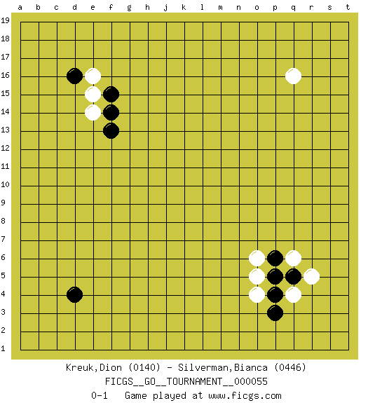 Last move : 0-1 2020 January 24 10:35:22 [Event "FICGS__GO__TOURNAMENT__000055"] [Site "FICGS"] [Date "2019.12.14"] [Round "1"] [Black "Kreuk,Dion"] [White "Silverman,Bianca"] [Result "0-1"] [Rating 1 "0140"] [Rating 2 "0446"] 1.d16 q16 2.d4 q4 3.p4 o6 4.p6 o4 5.p5 q6 6.p3 e14 7.q5 r5 8.f14 o5 9.f13 e15 10.f15 e16 0-1 This go game has been lost on time (started : 2019.12.14 13:40:28) Here are the names of the openings (joseki) played in the four corners : Corner q4 : q4 p4 Hoshi (Hwajeom, Seongjeom, Xingwei`) 4-4 Point. The star or hoshi (4-4) point, emphasizing influence at the potential expense of territory. Corner d16 : d16 e14 Hoshi (Hwajeom, Seongjeom, Xingwei`) 4-4 Point. The star or hoshi (4-4) point, emphasizing influence at the potential expense of territory. Player White won this Go (weiqi, baduk) game. Follow this game move after move (download)Those who are good at winning, don't usually fight. (Zhang) If we don't succeed, we run the risk of failure. (George W. Bush)