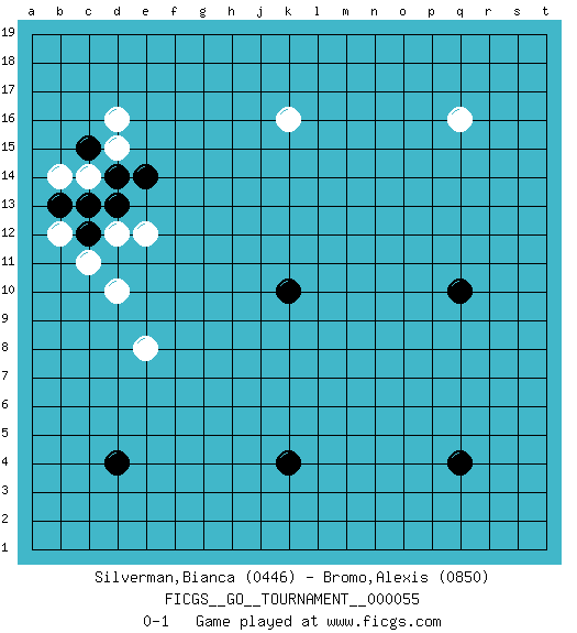 Last move : 0-1 2020 January 27 14:11:54 [Event "FICGS__GO__TOURNAMENT__000055"] [Site "FICGS"] [Date "2019.12.14"] [Round "1"] [Black "Silverman,Bianca"] [White "Bromo,Alexis"] [Result "0-1"] [Rating 1 "0446"] [Rating 2 "0850"] 1.q4 d16 2.d4 q16 3.k4 d10 4.q10 k16 5.k10 e8 6.e14 d15 7.d14 c14 8.c13 b12 9.c15 b14 10.c12 c11 11.b13 d12 12.d13 e12 0-1 This go game has been lost on time (started : 2019.12.14 13:40:28) Here are the names of the openings (joseki) played in the four corners : Corner d4 : d4 e8 Hoshi (Hwajeom, Seongjeom, Xingwei`) 4-4 Point. The star or hoshi (4-4) point, emphasizing influence at the potential expense of territory. Corner d16 : d16 e14 Hoshi (Hwajeom, Seongjeom, Xingwei`) 4-4 Point. The star or hoshi (4-4) point, emphasizing influence at the potential expense of territory. Player White won this Go (weiqi, baduk) game. Follow this game move after move (download)Corner, side, centre. (Anonymous) The Internet is the first thing that humanity has build that humanity doesn't understand, the largest experiment in anarchy that we have ever had. (Eric Schmidt)