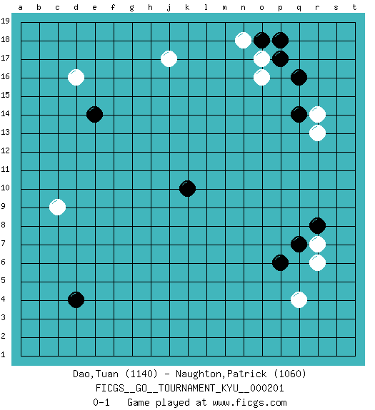 Last move : 0-1 2020 February 3 1:36:23 [Event "FICGS__GO__TOURNAMENT_KYU__000201"] [Site "FICGS"] [Date "2019.12.15"] [Round "1"] [Black "Dao,Tuan"] [White "Naughton,Patrick"] [Result "0-1"] [Rating 1 "1140"] [Rating 2 "1060"] 1.q16 d16 2.d4 q4 3.k10 o17 4.p17 o16 5.o18 n18 6.p18 j17 7.e14 c9 8.p6 r6 9.q7 r7 10.r8 r14 11.q14 r13 0-1 This go game has been lost on time (started : 2019.12.15 5:32:20) Here are the names of the openings (joseki) played in the four corners : Corner q16 : q16 o17 Hoshi (Hwajeom, Seongjeom, Xingwei`) 4-4 Point. The star or hoshi (4-4) point, emphasizing influence at the potential expense of territory. Ikken Kakari (Hankan Keolch'im, Yi Gua`jiao~, 1-Space Low Approach). White 2 is the standard approach move to the 4-4. Corner d4 : d4 c9 Hoshi (Hwajeom, Seongjeom, Xingwei`) 4-4 Point. The star or hoshi (4-4) point, emphasizing influence at the potential expense of territory. Corner q4 : q4 p6 Hoshi (Hwajeom, Seongjeom, Xingwei`) 4-4 Point. The star or hoshi (4-4) point, emphasizing influence at the potential expense of territory. Player White won this Go (weiqi, baduk) game. Follow this game move after move (download)Everything would seem to be possible in Go. Like pulling a rabbit, by a magical move, out of a hat. (Pierre Audouard) When it is a question of money, everybody is of the same religion. (Voltaire)