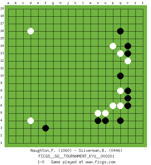 Last move : 1-0 2020 February 2 12:58:1 [Event "FICGS__GO__TOURNAMENT_KYU__000201"] [Site "FICGS"] [Date "2019.12.15"] [Round "1"] [Black "Naughton,Patrick"] [White "Silverman,Bianca"] [Result "1-0"] [Rating 1 "1060"] [Rating 2 "0446"] 1.q16 d4 2.q4 d16 3.f3 p6 4.r6 q6 5.o4 o5 6.n4 n5 7.q10 p14 8.r14 q13 9.r13 r12 10.r7 q8 11.r8 1-0 This go game has been lost on time (started : 2019.12.15 5:32:20) Here are the names of the openings (joseki) played in the four corners : Corner d4 : d4 f3 Hoshi (Hwajeom, Seongjeom, Xingwei`) 4-4 Point. The star or hoshi (4-4) point, emphasizing influence at the potential expense of territory. Ikken Kakari (Hankan Keolch'im, Yi Gua`jiao~, 1-Space Low Approach). Black 2 is the standard approach move to the 4-4. Corner q4 : q4 p6 Hoshi (Hwajeom, Seongjeom, Xingwei`) 4-4 Point. The star or hoshi (4-4) point, emphasizing influence at the potential expense of territory. Corner q16 : q16 p14 Hoshi (Hwajeom, Seongjeom, Xingwei`) 4-4 Point. The star or hoshi (4-4) point, emphasizing influence at the potential expense of territory. Player Black won this Go (weiqi, baduk) game. Follow this game move after move (download)Fighting must not be the key to go, it should be reserved as your last resource. (Zhong-Pu Liu, about Weiqi) Knowledge will give you power, but character respect. (Bruce Lee)