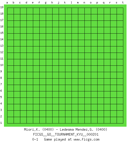 Last move : 0-1 2020 January 14 16:58:50 [Event "FICGS__GO__TOURNAMENT_KYU__000201"] [Site "FICGS"] [Date "2019.12.15"] [Round "1"] [Black "Miori,Kamioshi"] [White "Ledesma Mendez,Generoso Aristides"] [Result "0-1"] [Rating 1 "0400"] [Rating 2 "0400"] 0-1 This go game has been lost on time (started : 2019.12.15 5:32:20) Here are the names of the openings (joseki) played in the four corners : Player White won this Go (weiqi, baduk) game. Follow this game move after move (download)Good moves and bad moves are bedfellows. (Anonymous) 'preceded by its own quotation yields a falsehood' preceded by its own quotation yields a falsehood. (W. V. O. Quine - Set Theory And Its Logic, 1953)