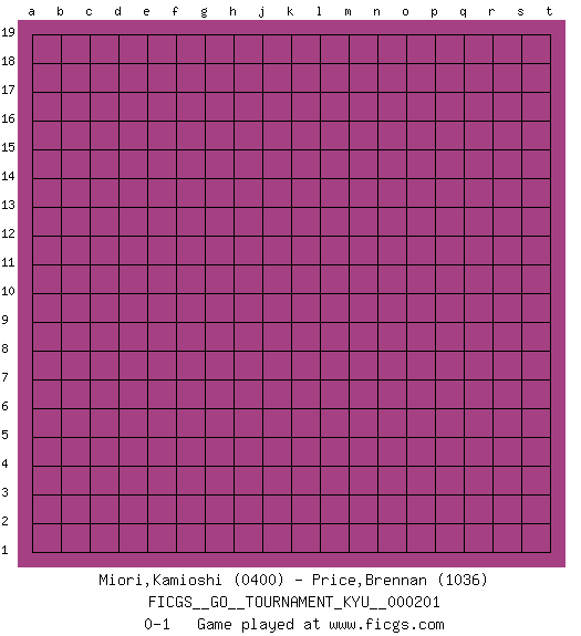 Last move : 0-1 2020 January 14 16:58:50 [Event "FICGS__GO__TOURNAMENT_KYU__000201"] [Site "FICGS"] [Date "2019.12.15"] [Round "1"] [Black "Miori,Kamioshi"] [White "Price,Brennan"] [Result "0-1"] [Rating 1 "0400"] [Rating 2 "1036"] 0-1 This go game has been lost on time (started : 2019.12.15 5:32:20) Here are the names of the openings (joseki) played in the four corners : Player White won this Go (weiqi, baduk) game. Follow this game move after move (download)Learning josekis by heart is useless if you don't try departing from them. (Pierre Audouard) There is a great deal of difference between an eager man who wants to read a book and a tired man who wants a book to read. (G.K. Chesterton)