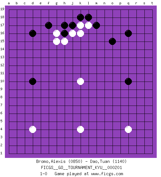 Last move : 1-0 2020 January 27 14:11:54 [Event "FICGS__GO__TOURNAMENT_KYU__000201"] [Site "FICGS"] [Date "2019.12.15"] [Round "1"] [Black "Bromo,Alexis"] [White "Dao,Tuan"] [Result "1-0"] [Rating 1 "0850"] [Rating 2 "1140"] 1.q16 d4 2.d16 q4 3.q10 k4 4.d10 k16 5.o15 k10 6.f17 g15 7.h16 g16 8.j17 k17 9.k18 j16 10.h17 h15 11.m17 l17 12.l18 1-0 This go game has been lost on time (started : 2019.12.15 5:32:20) Here are the names of the openings (joseki) played in the four corners : Player Black won this Go (weiqi, baduk) game. Follow this game move after move (download)The comb formation is alive. (Anonymous) It's only after you lost everything, Tyler says, that you're free to do anything. (Chuck Palahniuk, Fight Club)