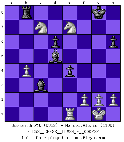Last move : 1-0 2020 January 5 7:42:16 [Event "FICGS__CHESS__CLASS_F__000222"] [Site "FICGS"] [Date "2019.12.15"] [Round "1"] [White "Beeman,Brett"] [Black "Marcel,Alexis"] [Result "1-0"] [WhiteElo "0952"] [BlackElo "1100"] 1.e4 g6 2.Nf3 Bg7 3.Bc4 e6 4.O-O Ne7 5.d4 O-O 6.Bg5 f6 7.Bf4 Nbc6 8.Re1 a6 9.Nc3 b5 10.Bb3 Na5 11.d5 Nxb3 12.axb3 e5 13.Be3 d6 14.Nxb5 Bb7 15.Nc3 f5 16.exf5 gxf5 17.Bg5 Qe8 18.b4 h6 19.Bxe7 Qxe7 20.b5 axb5 21.b4 Qf7 22.Rxa8 Rxa8 23.Nxb5 Bf6 24.c3 e4 25.Nfd4 Qd7 26.Qh5 Bxd5 27.Qxf5 Qxf5 28.Nxf5 Rb8 29.Nxc7 Bxc3 30.Ne7+ 1-0 Robatsch (Modern) defense Kingside Castling by player White (move 4) Kingside Castling by player Black (move 5) Player White won this chess game. Follow this game move after move (download)Chess is a matter of delicate judgment, knowing when to punch and how to duck. (Bobby Fischer) Nie in meinem Leben habe ich die französische Verteidigung gespielt, welche die Stumpfsinnigste von allen ist. (Wilhelm Steinitz) Cualquier cambio de material en una posición debe venir por medio de un mate, una captura o promoción de Peón. (Purdy) Avec des compensations pour le matériel en plus... (Anonyme) The intuitive mind is a sacred gift; the rational mind is a faithful servant. We have created a society that honors the servant but has forgotten the gift. (Albert Einstein)